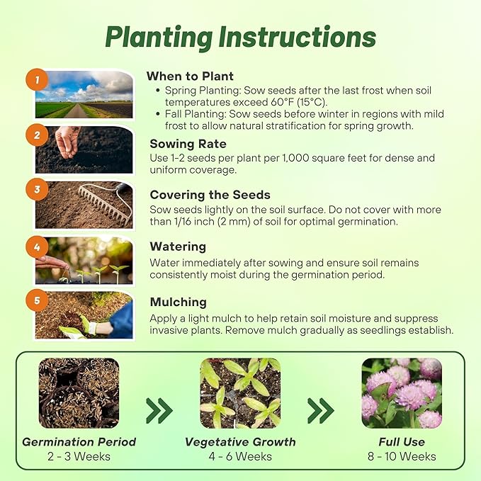 - Sowing Rate: 1 - 2 seeds per plant. Given temperatures of 68 – 75F, germination is usually within 10 days. Space the plants 12 – 18 inches apart. If growing Globe Amaranth for cutting, place the plants closer together to encourage longer stem growth.
