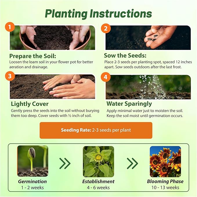 - Sow Sunflower seed directly outdoors after frost danger has passed. In a prepared seedbed that is weed-free, place 2 - 3 seeds per plant 12 inches apart and cover 1/2 inch deep with soil.