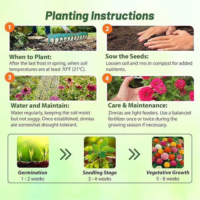 - EASY-TO-GROW VARIETY: Each zinnia seed thrives in warm climates, blooming in just 6–8 weeks. Perfect for zinnia mix collections or standalone displays, they grow best in full sun and well-drained soil, adding charm to drought-friendly gardens with minimal care.