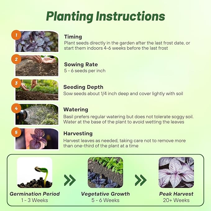 - BEAUTIFUL PURPLE FOLIAGE & AROMATIC FLAVOR: Our purple basil seeds produce vibrant purple leaves with a sweet, aromatic flavor. These sweet basil seeds are perfect for adding color and flavor to salads, sauces, and garnishes. Ideal for both indoor herb gardens and outdoor spaces, they enhance any garden with stunning purple leaf foliage.