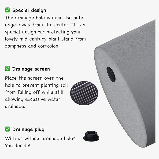 • DRAINAGE PLUG & SPECIAL DESIGN - This flower pot has a drainage hole in bottom to prevent over watering for the plants, comes with drainage plug. With or without drainage hole? You decide! The drainage hole is near the outer edge, away from the center. It is a special design for protecting your lovely mid century plant stand from dampness and corrosion.