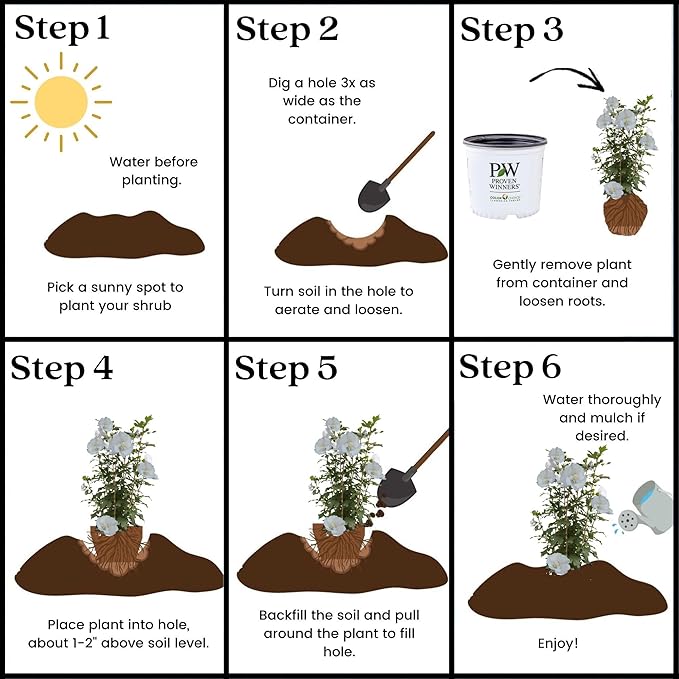 - Product Care Instructions : Water before planting• Plant in Full Sun• Dig hole 3X the width of pot• Back-fill and plant 1″-2″ above soil level• Water and add more soil if needed• Mulch plants• Fertilize in early spring Water before planting• Plant in Full Sun• Dig hole 3X the width of pot• Back-fill and plant 1″-2″ above soil level• Water and add more soil if needed• Mulch plants• Fertilize… See more