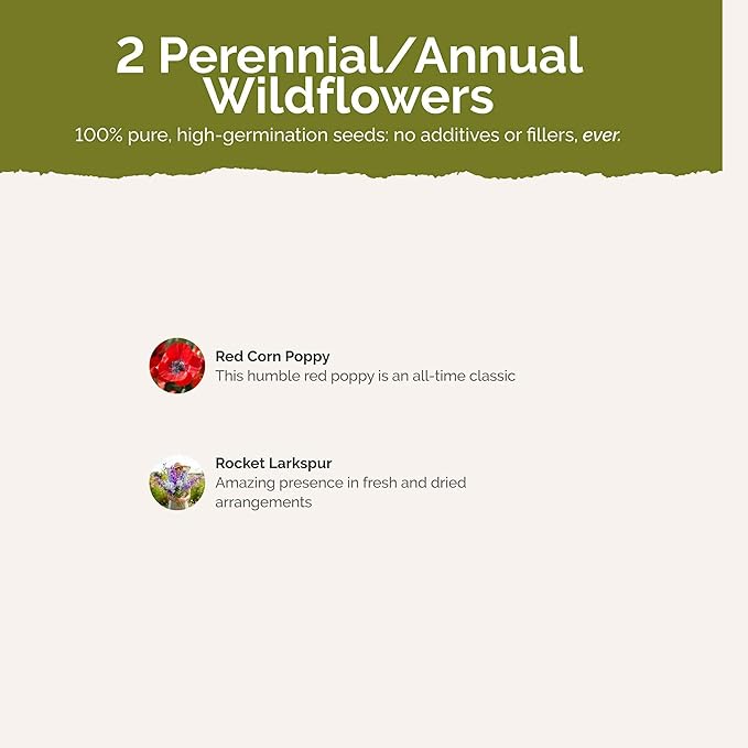 - Mix includes 50% Annual, 50% Perennial: Red Corn Poppy, Delphinium Lilac Spire. Mix contents are subject to change.