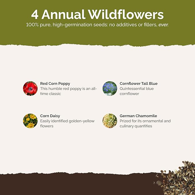 - 100% Pure, Non-GMO Seeds - No fillers, favorites only! Includes 4 easy-to-grow species: Cornflower Tall Blue, Corn Daisy, German Chamomile, and more
