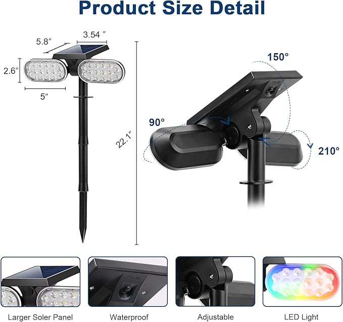- πγDouble Heads 210Β° Adjustableγ Double heads design of our solar colored landscape spot lights, the lighting area is larger, 210Β°adjustable no wires to run multicolored solar spotlight, Zero electricity bill.