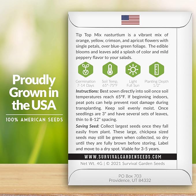 - Edible and Tasty - The flowers and leaves of Tip Top nasturtium are edible and will add a peppery flavor to your salads. They are technically a brassica and are a good companion plant to grow, attracting pollinators like bees, hummingbirds, and butterflies. A tasty & beautiful addition to your vegetable garden flower mix.