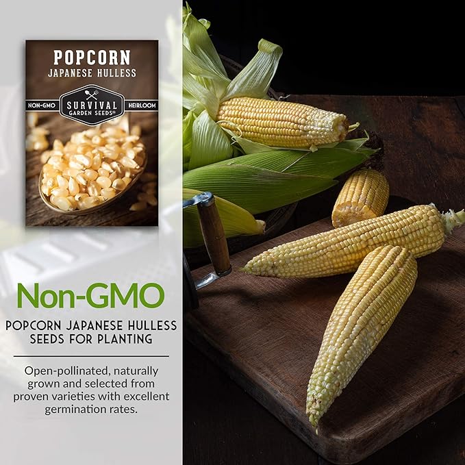 Survival Garden Seeds - Japanese Hulless Popcorn Seed for Planting - 2 Packs with Instructions to Plant and Grow Delicious Kernel Popcorn in Your Home Vegetable Garden - Non-GMO Heirloom Variety