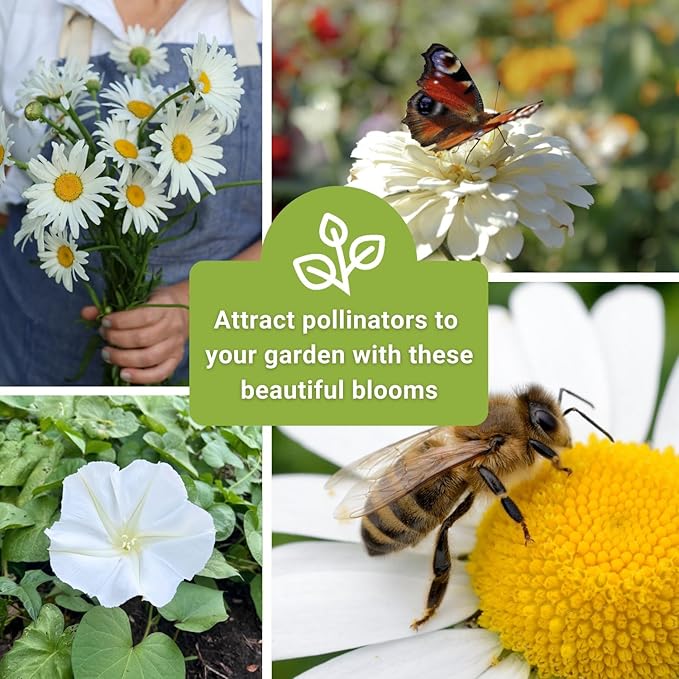 - Beautiful - Five large individual packets of Zinnia Polar Bear (Zinnia elegans), White Carpet of Snow Alyssum (Lobelia maritima), Moonflower (Ipomoea alba), Annual Baby’s Breath (Gypsophila elegans), and Shasta Alaska Daisy (Chrysanthemum maximum) seeds.