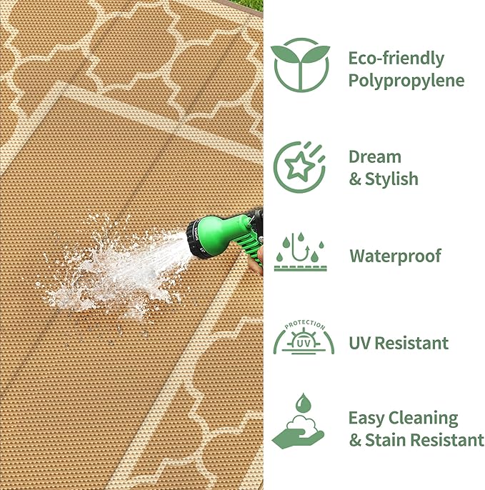- Upgraded Materials & Reversible Use:GENIMO's outdoor plastic straw rug, crafted from recyclable polypropylene, features eye-catching patterns and is fully reversible. Waterproof and durable, it's an ideal choice for patios and outdoor relaxation, especially as part of your camping essentials. Thanks to the upgraded weaving process, whether used on one side or the other, it seamlessly integrates with the outdoor environment, bringing joyful moments.Also perfect as a fall outdoor rug
