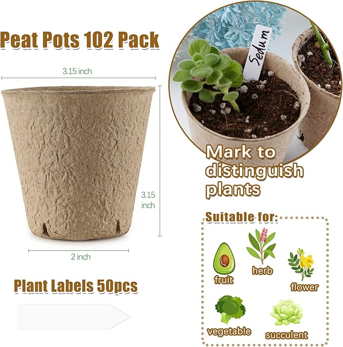 - [BIODEGRADABLE PEAT SEEDLING POTS KIT] The set contains 102 packs of 3.15-inch diameter organic peat pots for raising seedlings of various plants, vegetables or fruit. The thicker material helps garden pots support the plant for longer while you encourage it to grow to ground-planting size. Comes with 50 plant labels, you can use to mark seeds in the seedling pots. If you have any problems with our peat pot, you can let us know. Your satisfaction is our aim