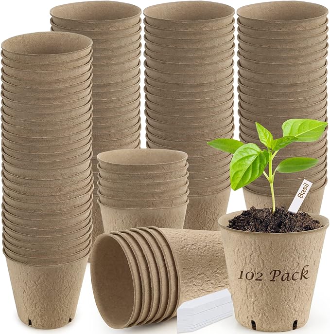 Peat Pots, 102 Pack 3.15 Inch Biodegradable Planting Peat Pots for Seedlings, Garden Plant Seed Starter Pots with Drainage Holes Seed Starting Pots for Organic Vegetable Flower, Bonus 50 Plant Labels
