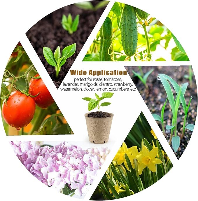 - [WIDE APPLICATION] Organic peat seedling pots are wide applied for planting seedling of vegetables, fruits, flowers, succulents, herbs, miniature green plants, etc. Such as roses, lavender, marigolds, cucumbers, tomatoes, cilantro, strawberry, watermelon, lemon, clover, etc. Seed starter trays can be used in gardens, indoors, greenhouse, and outdoors. In addition to being greener and practical, peat planter also serve as home decorative greenery to make home look more natural and air fresher
