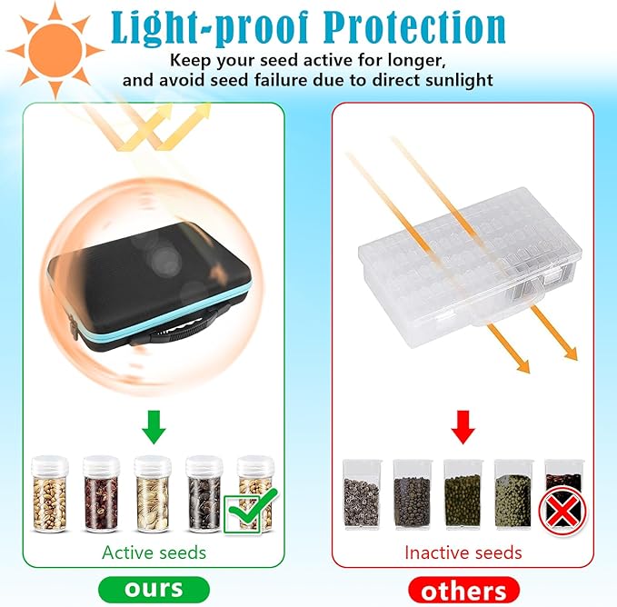 - Multiple Protection: All seed organizer boxes are seated securely in sponge holes to avoid collisions between boxes. Compared to large plastic boxes, the high-quality zipper bag can provide more cushioning and is not easily damaged. And seed organizer bag can provide light-proof protection, allowing them to maintain vitality for longer