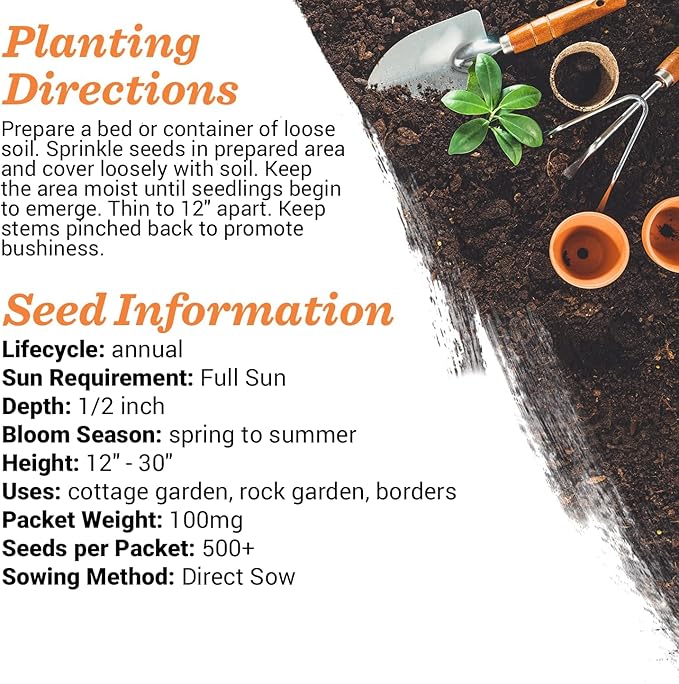 - PLANTING DIRECTIONS: Prepare a bed or container of loose soil. Sprinkle seeds in prepared area and cover loosely with soil. Keep the area moist until seedlings begin to emerge. Thin to 4"-6" apart. Keep stems pinched back to promote bushiness.