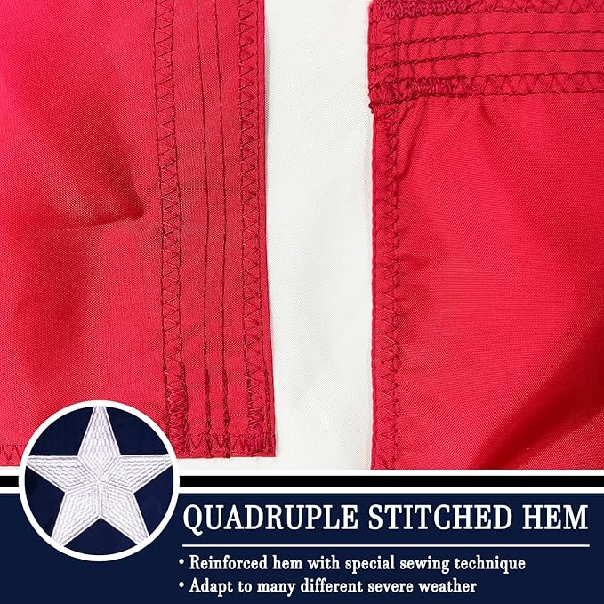 - GREAT WORKMANSHIP: The embroidery stars and sewing are made with precision craftsmanship. The superb double stitching makes the flag more durable and waterproof. This flag can withstand high winds, due to the quadruple stitched hem