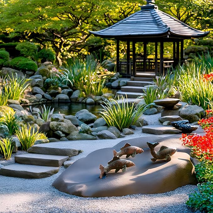 - CLYB Garden Pond Koi Fish Sculptures & Statues - The handmade antique copper fish sculpture has elegant and attractive design and colors for wonderful visual enjoyment. The unique design is perfect for those looking for something different than the traditional garden decor.