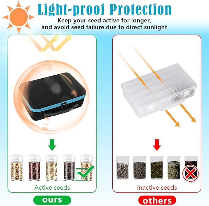 - Multiple Protection: All seed organizer boxes are seated securely in sponge holes to avoid collisions between boxes. Compared to large plastic boxes, the high-quality zipper bag can provide more cushioning and is not easily damaged. And seed organizer bag can provide light-proof protection, allowing them to maintain vitality for longer