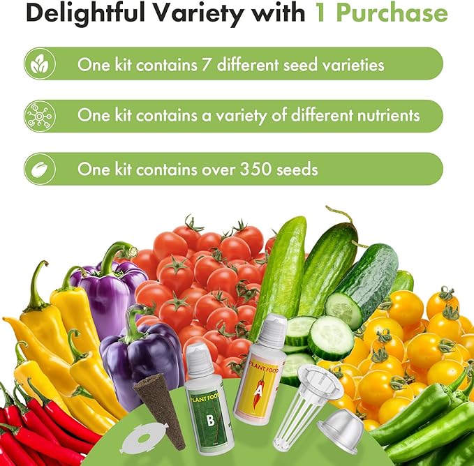 - 【Complete Accessories】Hydroponic red heirloom cherry tomato seed kit not only has 7 kinds of herbal hydroponic seeds (Red chili pepper, Green pepper, Yellow pepper, Purple bell pepper, Cucumber, Red cherry tomato, Golden cherry tomato) but also includes a set of 12 growth sponges, 12 pod labels, 12 baskets, 12 domes, and A&B Plant Food. With more than 350+ seeds to choose from, choose your favorite hydroponic seeds to plant and enjoy endless planting fun!