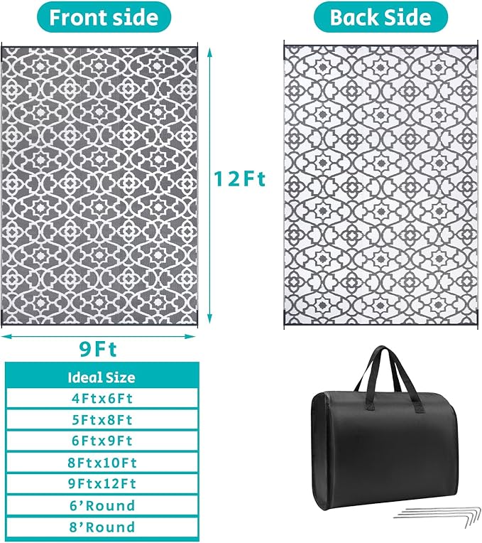 - XXL Reversible Outdoor RV Mats 9x12: The extra large 9x12 ft outdoor porch rug with unique boho floral design, which makes it easy to use on patio,camper, deck, beach, backyard. And this outside camping rug is reversible, two-sided design allows you to have two different looks.