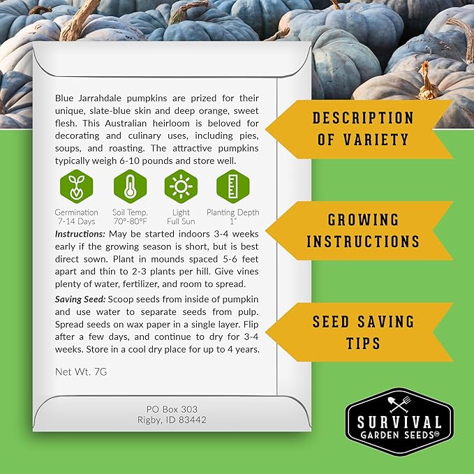 Blue Jarrahdale Pumpkin Seeds for Planting - 5 Packets with Instructions to Plant & Grow Decorative and Flavorful Blue Pumpkins in Your Home Garden - Non-GMO Heirloom Variety - Survival Garden Seeds