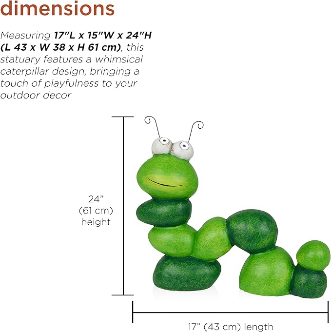 - Durable and Weather Resilient: Durable contruction withstands the elements to maintain the caterpillar's meticulous details that create a charming focal point in your outdoor living space