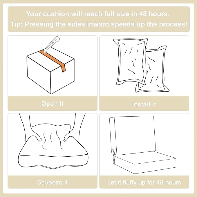 - Size Selection - Set includes a seat bottom measuring 22” W x 22” D x 3” T and a cushion back measuring 22” W x 18.5” H x 3” T. ( The size description is only for the cushion size, accurately measuring the dimensions of your furniture's seating area in advance, make sure the cushion size fits your furniture ). Slight size variations (±0.5") may occur due to handcrafted cutting. Please allow 48 hours for cushion to fully expand after opening.