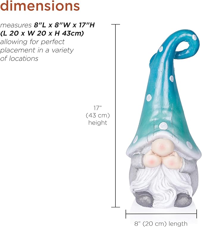 - IDEAL SIZE: Standing 17” high with dimensions of 8"L x 8"W x 17"H, this gnome statue is the perfect size to complement flower beds, walkways, patios, or your front yard without overpowering the space.
