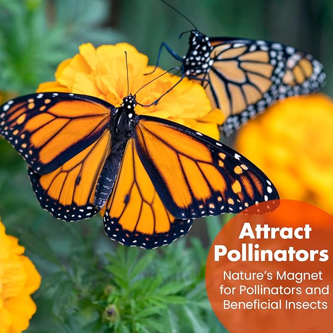 - Attract and Protect: Marigolds attract pollinators and beneficial insects like bees, ladybugs, lacewings, and parasitic mini-wasps; enhancing garden health and biodiversity