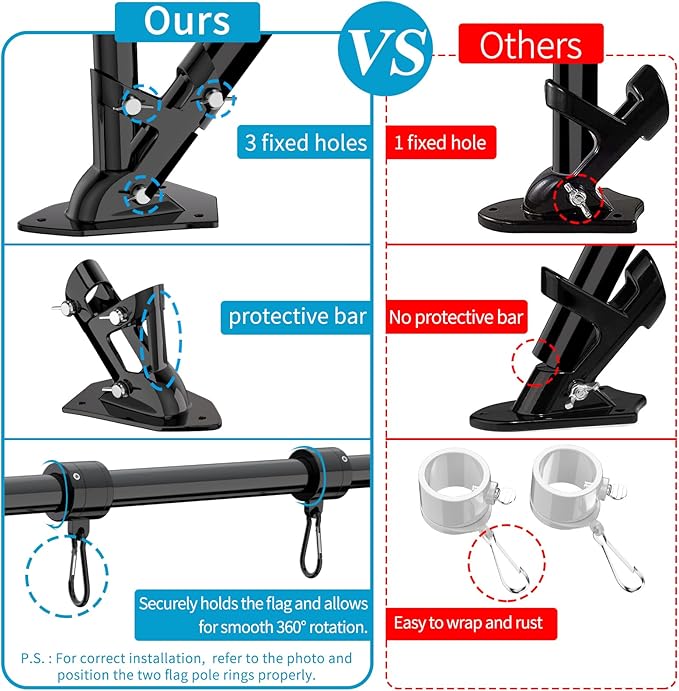 - 🇺🇲Upgraded Bracket and Tangle Free Rings: The high strength aluminum alloy flag pole holder has unique protective bar and 3 fixed holes to make the two-position (90° and 45°) flag pole more stable. The two new designed flag rings and two sturdy carabiners, which could make the flag tangle-free in the wind. And Adjustable length swivel flag pole kit can be installed according to the different size flags.