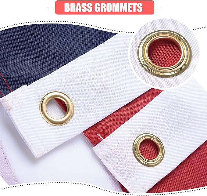 - Strong, Durable: The USA flags 15x25 outdoor, four point needle fly hem (4 rows of stitching), brass grommets. Fly your big united states flags proudly in the rain, snow, high winds, and sunshine! The perfect all-weather, outdoor American Flag banners.