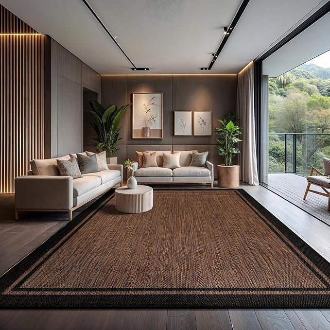 CAMILSON Indoor Outdoor Rug, 9x12 Bordered Nut Brown Black Modern Area Rugs for Indoor and Outdoor Patios, Kitchen and Hallway Mats, Washable Porch Deck Outside Carpet (Border Nut Brown Black, 9 x 12)