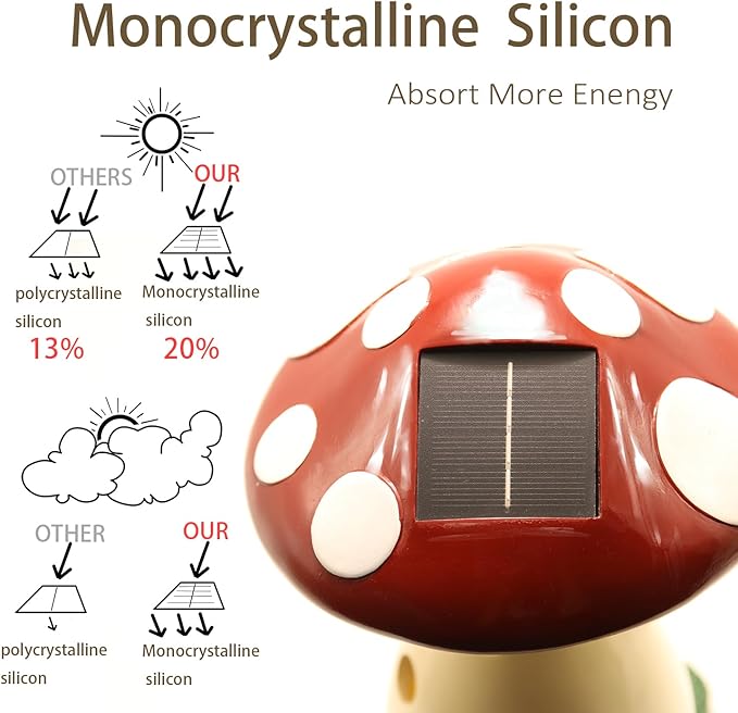 - Size: Heightβ24.9 cm / 9.8 inches, Widthβ14.9 cm / 5.9 inches, Depthβ14.9 cm / 5.9 inches. The mushroom-shaped cottage fosters a cozy atmosphere, and each solar yard decor piece is handcrafted to ensure that everyone is unique.