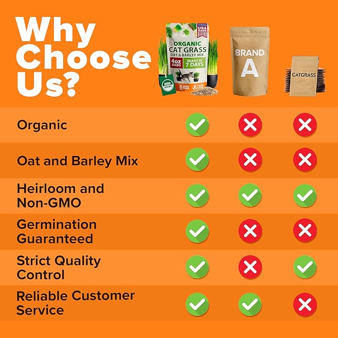 - PREMIUM QUALITY USA-SOURCED ORGANIC SEEDS - Our non-GMO, heirloom seeds are sourced in the USA, ensuring top-tier quality for your pet. These organic cat grass seeds include a mix of oat and barley grasses for variety and health benefits.