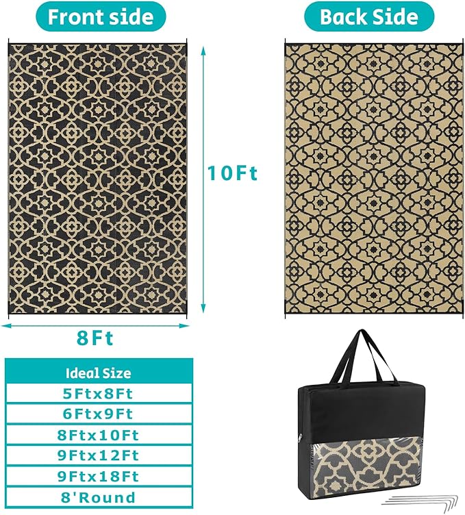 - XXL Large Reversible Outdoor Rugs: Featuring a classic moroccan pattern on both sides, this rectangular 8x10 ft outdoor area rug allows you to instantly refresh your patio, porch, backyard, deck, RV campsite. And this outdoor deck rug is reversible, two-sided design allows you to have two different looks,both sides can blend perfectly with nature and look very full and comfortable.
