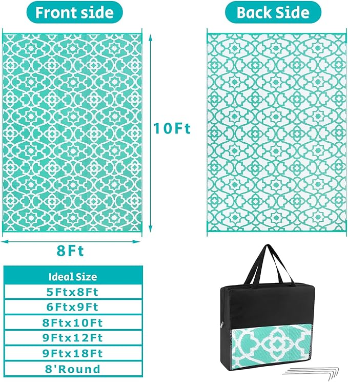 - XXL Large Reversible Outdoor Rugs: Featuring a classic moroccan pattern on both sides, this rectangular 8x10 ft outdoor area rug allows you to instantly refresh your patio, porch, backyard, deck, RV campsite. And this outdoor deck rug is reversible, two-sided design allows you to have two different looks,both sides can blend perfectly with nature and look very full and comfortable.