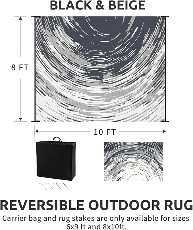 - RV traval&Camping: This camper must haves outdoor rug is ideal for picnics, gatherings, and RV trips! The lightweight outdoor camping carpet with foldable lines is easy to carry and saves space. Includes an extra carry bag and rug stakes for 6x9 ft, 8x10 ft and 9x12 ft. Grass-friendly, durable, and easy to clean, this outdoor rug enhances outdoor adventures.