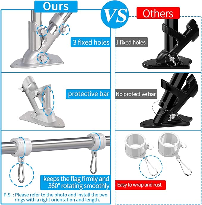 - Upgraded Bracket and Tangle Free Rings: The high strength aluminum alloy flag pole holder has unique protective bar and 3 fixed holes to make the two-position (90° and 45°) flag pole more stable. The two new designed flag rings and two sturdy carabiners, which could make the flag tangle-free in the wind. And Adjustable length swivel flag pole kit can be installed according to the different size flags.