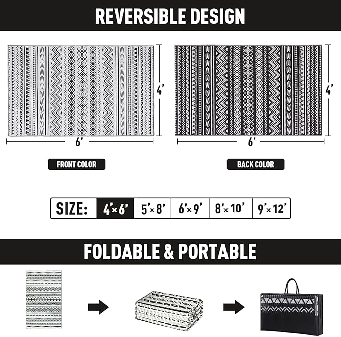 WILDROOTS 4x6 Feet Black and White Plastic Outdoor Rug, Stain Resistant Waterproof Reversible Outdoor Patio Rug, Fade Resistant Camping Rug
