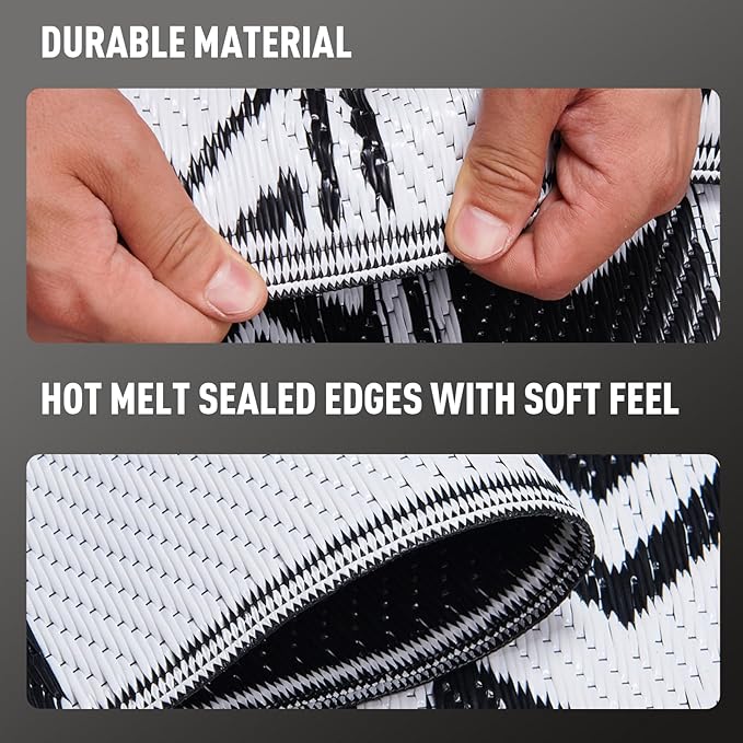 - Portable & Durable: This outdoor plastic rug with seams can be rolled or folded into a compact size and comes with a carrying bag for easy portability. Perfect for outdoor activities, picnics, sunbathing, and RV road trips. The heat-sealed edges prevent wear and tear, withstanding any environment, traffic, or scratches