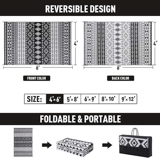- Reversible Design: This double-sided patio rug features beautiful patterns on both sides, allowing you to quickly flip it over and instantly refresh your patio, porch, backyard, deck, RV campsite, or any outdoor space. A simple way to transform your style effortlessly