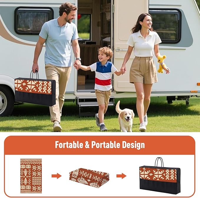 - Portable & Durable: This outdoor plastic rug with seams can be rolled or folded into a compact size and comes with a carrying bag for easy portability. Perfect for outdoor activities, picnics, sunbathing, and RV road trips. The heat-sealed edges prevent wear and tear, withstanding any environment, traffic, or scratches